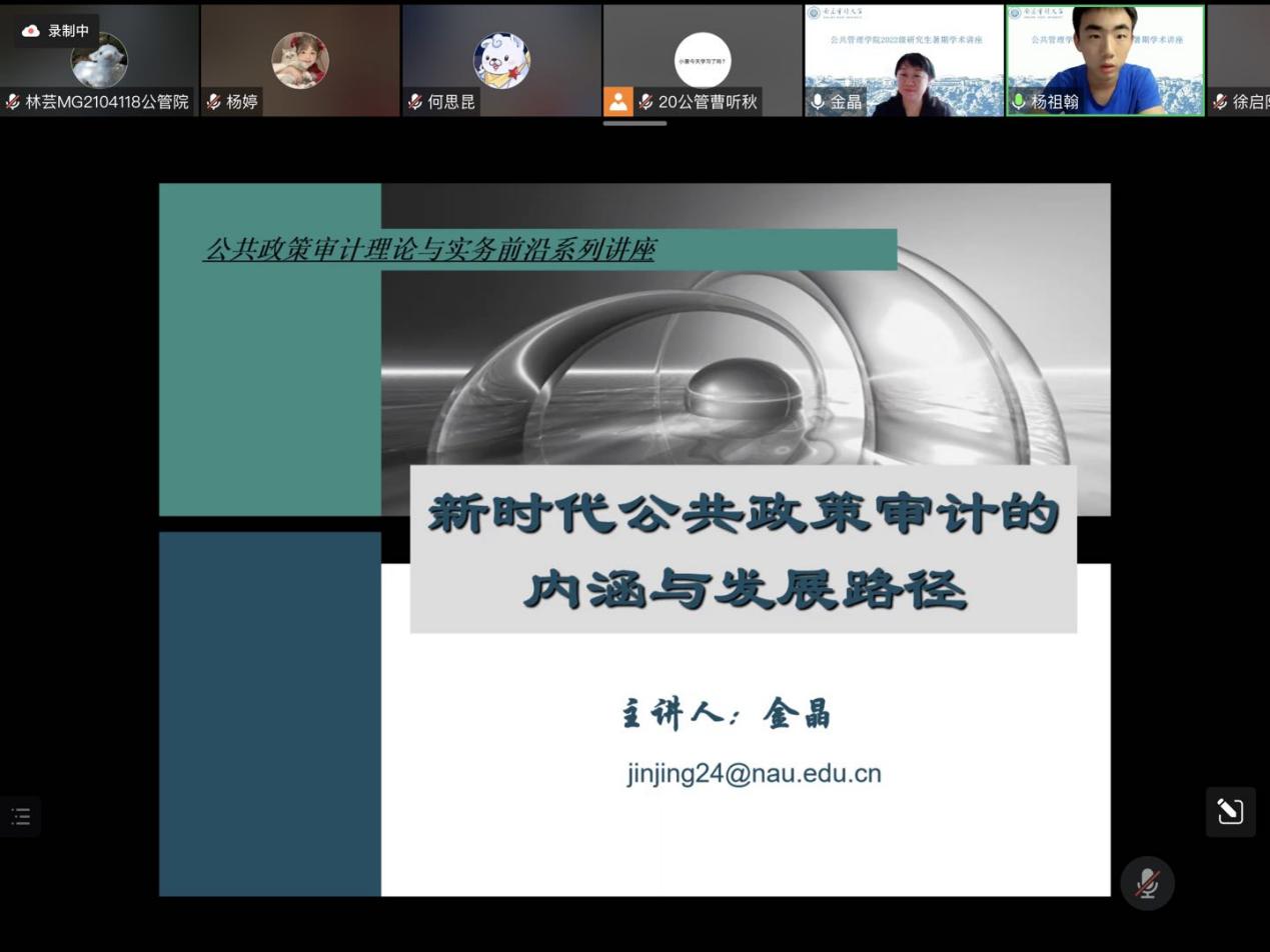 2022年7月18日上午,bet356体育亚洲版在线官网公司党委书记金晶为2022级研究生新生开展题为“新时代公共政策审计的内涵与发展路径”的学术讲座。此次讲座为bet356体育暑期研究生新生系列培训项目之一,旨在提升研究生学术素养,拓展学术研究视野。讲座采用线上方式进行,bet356体育2022级研究生参加了此次讲座,讲座由bet356体育研究生会主席曹听秋主持。